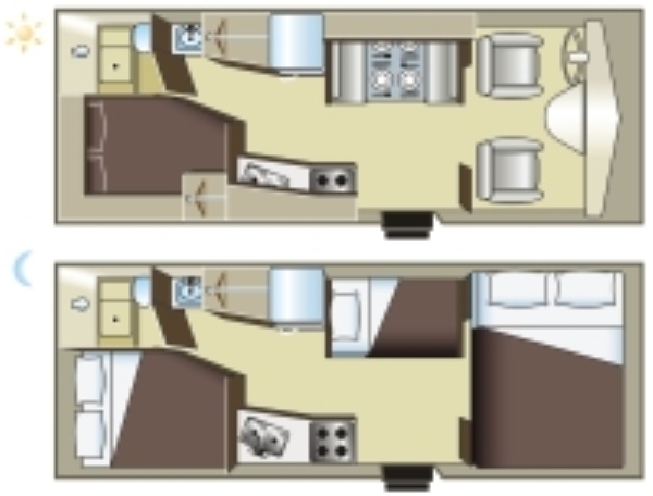 De bedden hebben bij benadering de volgende afmetingen: 135×203 (cabover), 113×167 (dinette) en 145×200 (rear). De camper is onder andere uitgerust met koelkast, oven, fornuis, magnetron, toilet, zonneluifel en douche.